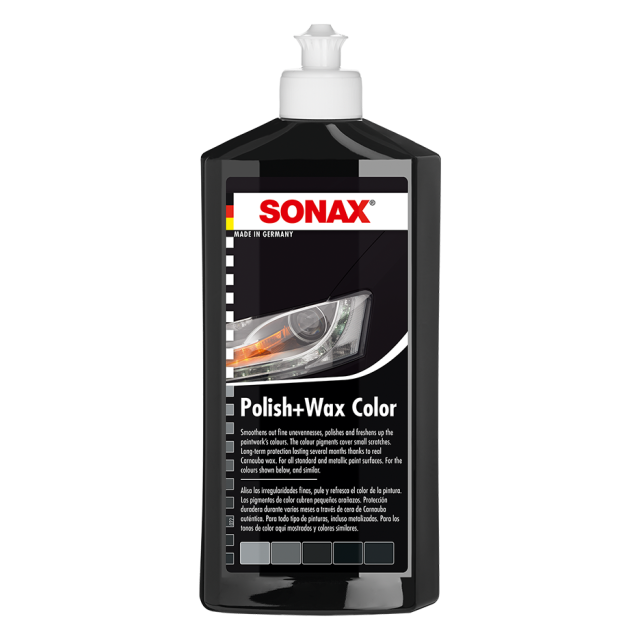 پولیش و واکس رنگی مشکی سوناکس یک پوليش رنگی با واکس کارنابای طبيعی برای انواع رنگ های مشکی استاندارد و متاليک است. رنگدانه های موجود در پولیش و واکس رنگی مشکی سوناکس خط و خش های ريز را می پوشاند و باعث محافظت بلند مدت رنگ شده و به آن درخشش و براقيت فوق العاده ای می دهد. تميز کردن، پوليش و حفاظت رنگ با واکس در يک حرکت.